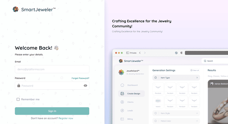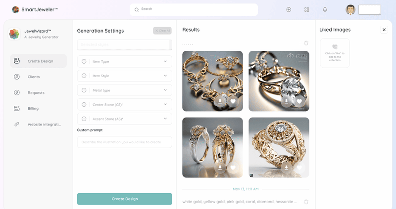 Однією з головних інновацій проекту стала інтеграція сервісу на базі Штучного Інтелекту, який автоматично генерує дизайн-макети ювелірних прикрас на основі введених клієнтом параметрів.