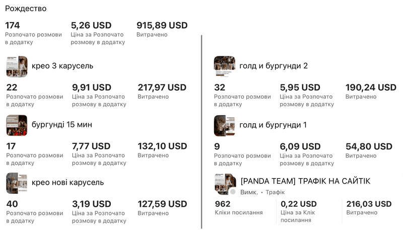 Благодаря креативам, подчеркивающим праздничное настроение, и эффективной рекламе через Instagram, мы достигли высокой эффективности. Основной акцент на прямые сообщения показал лучшую конверсию и активность пользователей.
