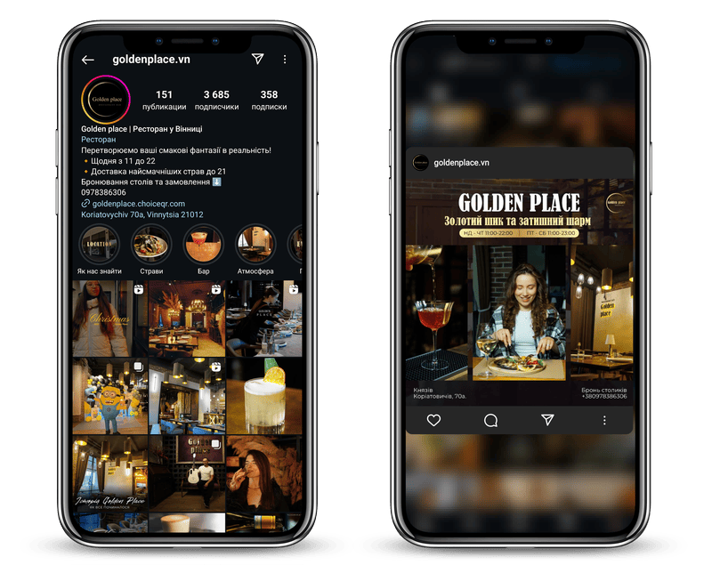 - Визуальный стиль: оформление профиля гармонично сочетает высокий уровень обслуживания и эксклюзивную кухню.